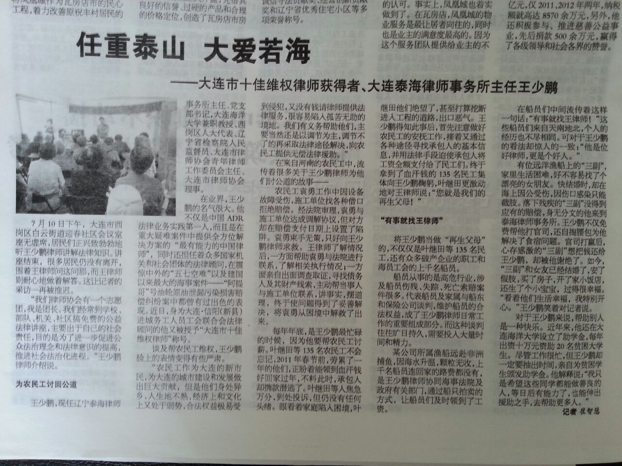 我所王少鹏主任荣获大连市十佳维权律师登报