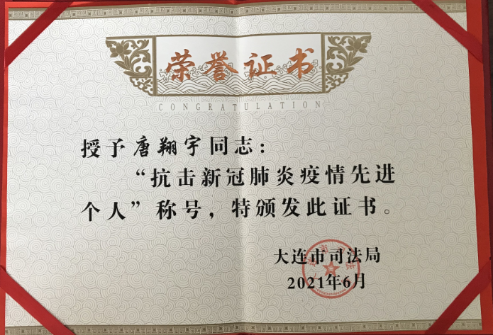 2021年6月,我所唐翔宇律师被大连市司法局授予“抗击新冠肺炎疫情先进个人”称号。