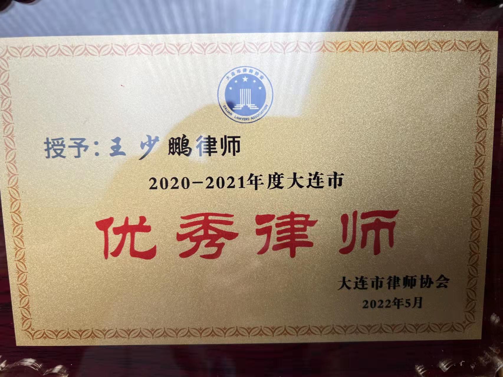 2022年11月7日,我所主任王少鹏律师被大连市律师协会授予“2020-2021”年度大连市优 秀律师称号