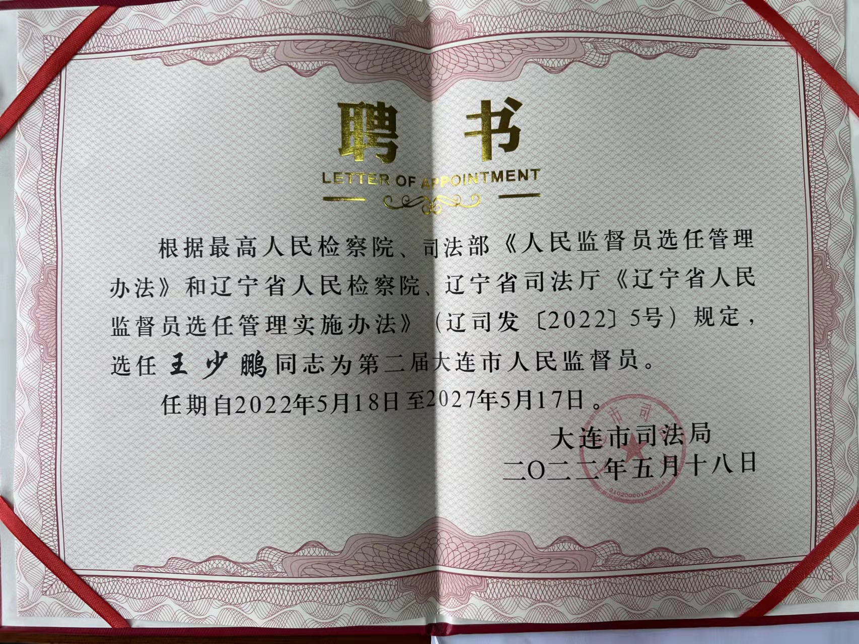 2022年11月7日,我所主任王少鹏律师被大连市司法局聘任为,“第二界大连市人民监督员”,任期自2022年5月18日至2027年5月17日。