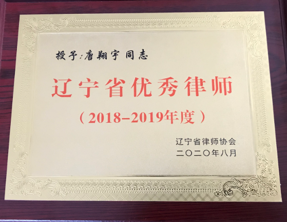 2021年8月,我所王少鹏主任律师及唐翔宇律师被辽宁省律师协会评选为2018-2019年度辽宁省优 秀律师。